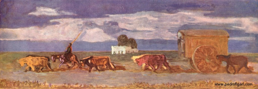 Q-03 - Pedro Figari - Carreta (óleo s/cartón) - Oxcart (oil on canvas) - 34.5x99cm